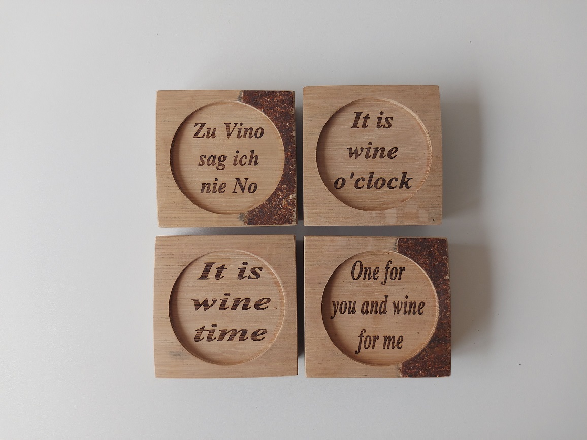 - Jedes Set Glasuntersetzer wird individuell aus massivem Eichen-Barriqueholz hergestellt